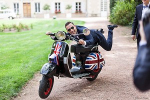 Photographie d’un marié en train de faire le fou le jour de son mariage sur un scooter.