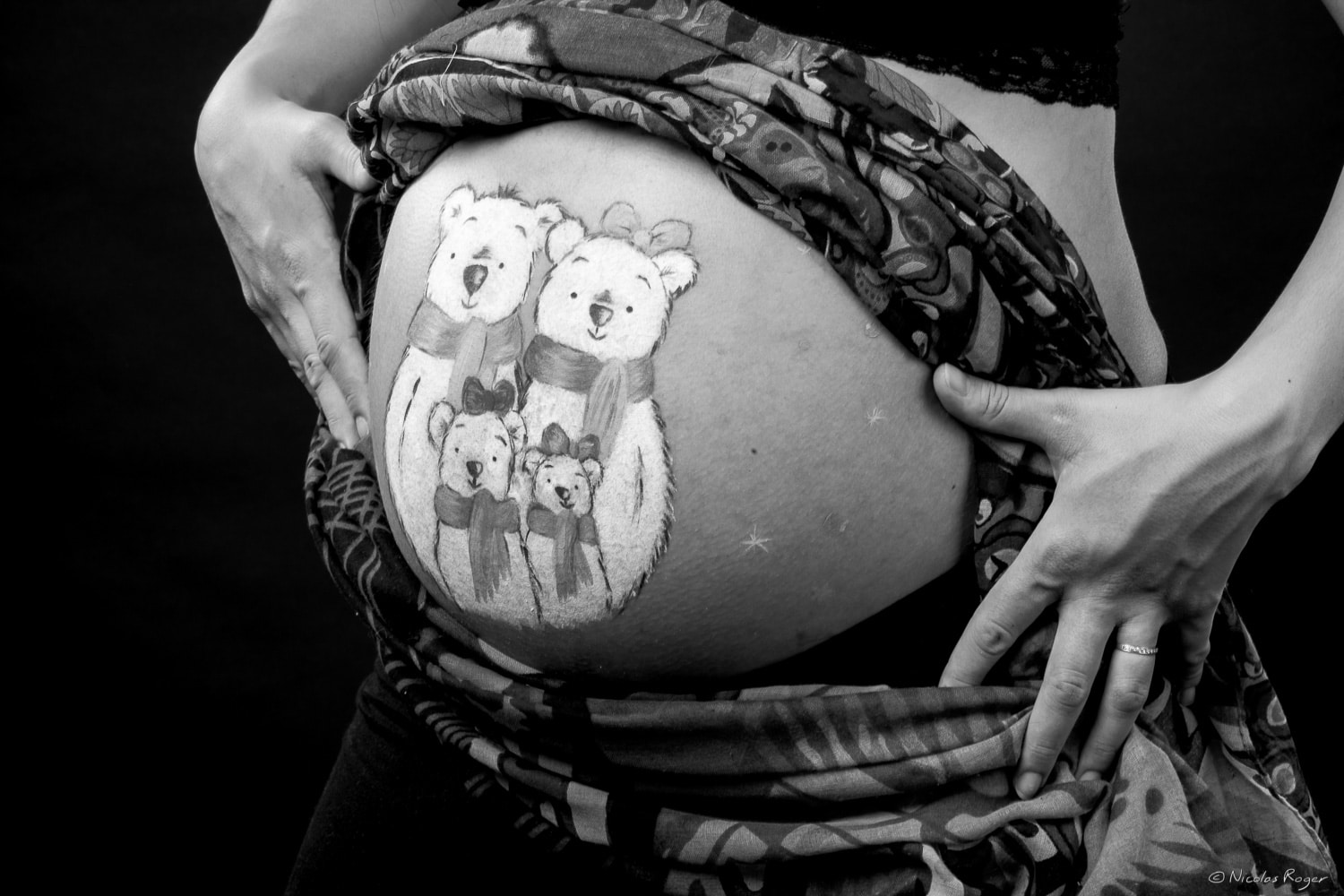 Photographie de grossesse en belly painting Retour à la galerie « Grossesse » Photographie de grossesse représentant la future famille au belly painting.