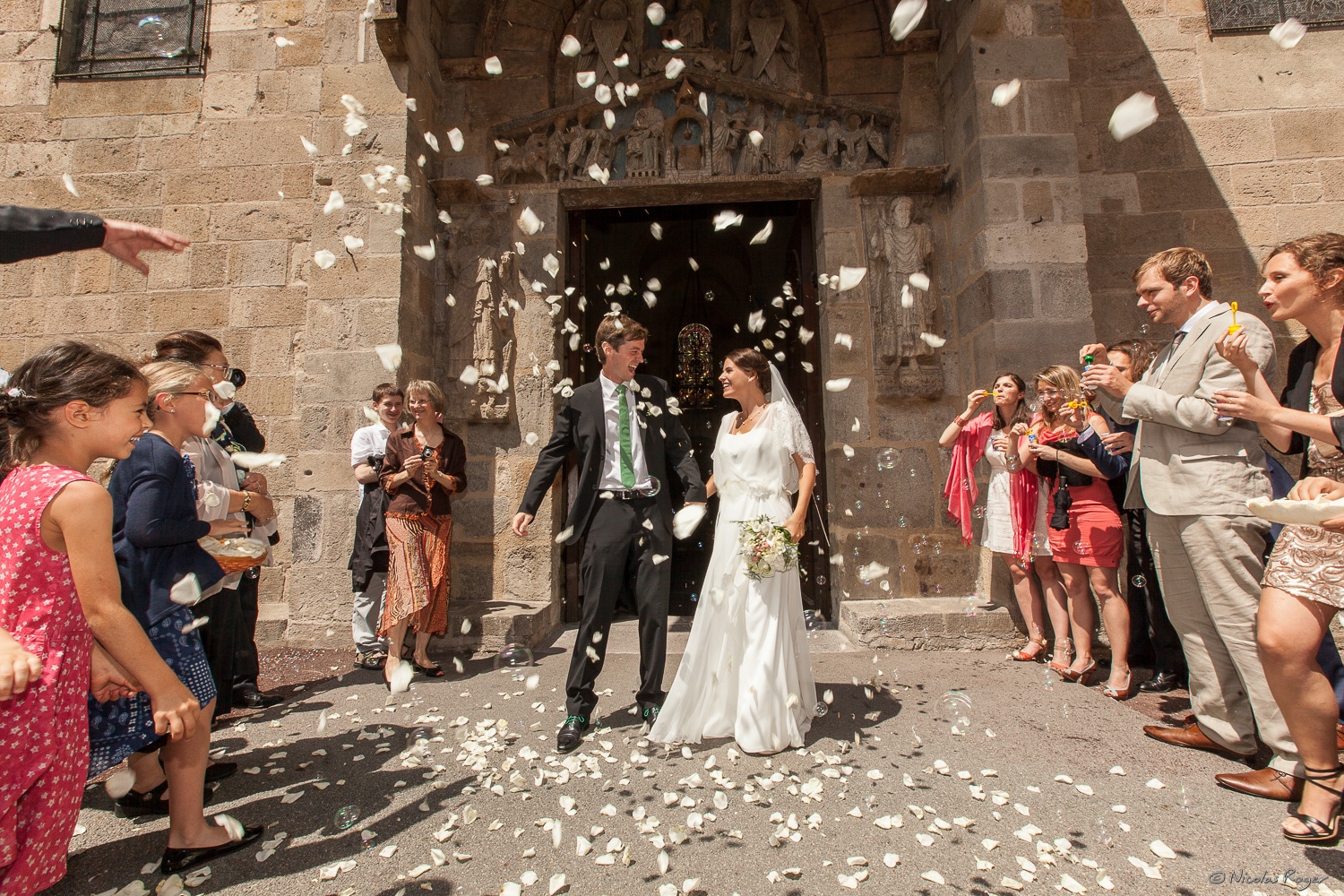Photographie de la sortie d’église des nouveaux mariés Retour à la galerie « Photos de mariage » Un grand moment que la sortie de l'église durant un mariage. Les invités jettent confettis, riz, pétales de fleurs sur les mariés pour célébrer leur nouvelle union.
